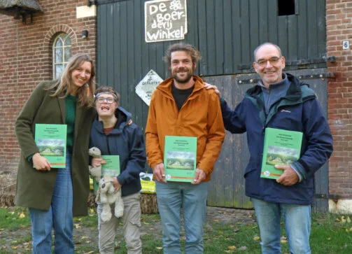 V.l.n.r.: Sonja en Thijs Roosjen, Koen Warnaar en Tjeerd Roosjen staand voor boerderij Oosterwaarde met hun exemplaar van het boek.