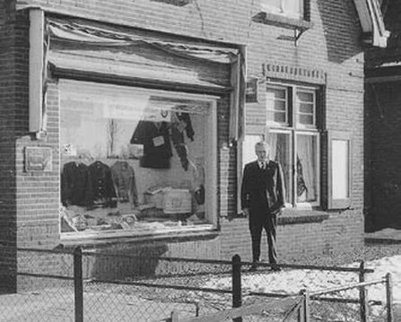 Albertus Kastelein (1907-1993) voor zijn winkel in 1963.