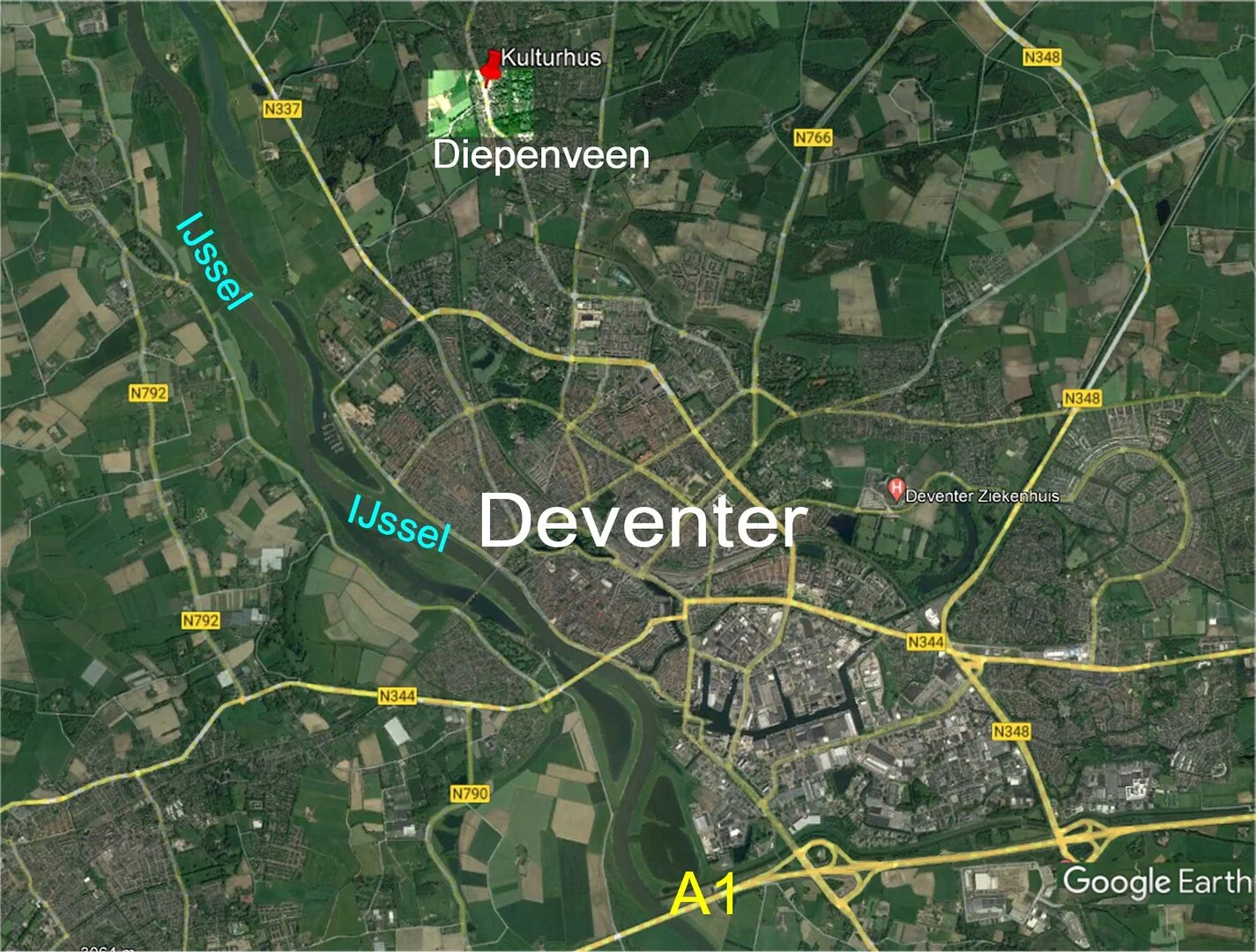 Door de centrale ligging is Diepenveen uitstekend te bereiken. Het dorp ligt ten noorden van Deventer en is bereikbaar vanaf de A1. De provinciale weg N337, van Deventer naar Zwolle, loopt aan de westkant van Diepenveen. Maak voor de navigatie gebruik van het adres van het Kulturhus in Diepenveen (Google Maps): Dorpsstraat 30, 7431 CL Diepenveen. Zie ook de bovenstaande kaarten voor de autoroutes naar de locatie in Diepenveen en de parkeermogelijkheden.