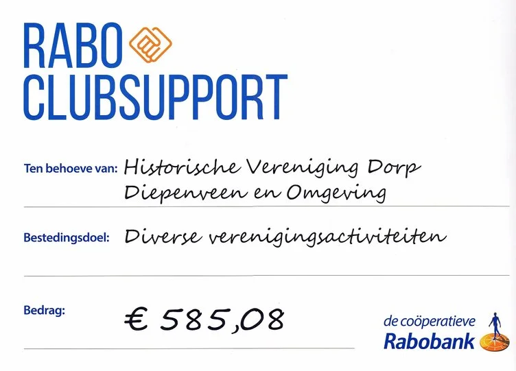 Van de RABO bank hebben we een cheque uitgereikt gekregen met het bedrag welke de Historische Vereniging ontvangt van de RABO Clubsupportactie 2024