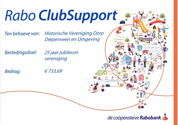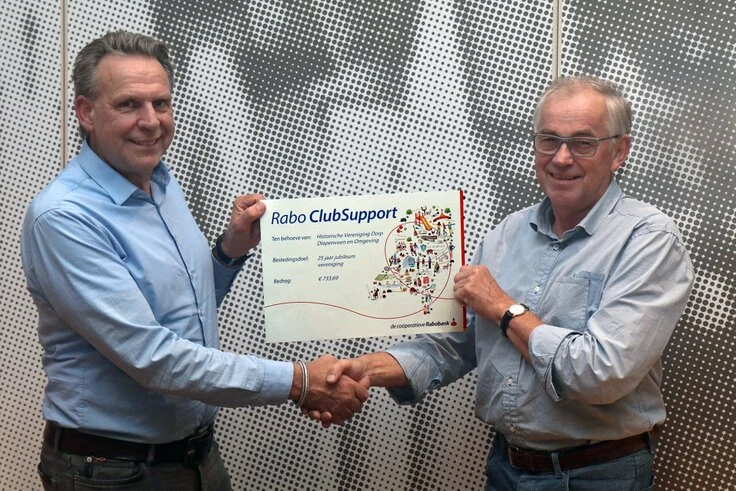 Penningmeester Jan Harmelink van de Historische Vereniging Dorp Diepenveen e.o. krijgt de cheque met een bedrag van €733 uitgereikt door de heer Maarten Vinkesteijn van de RABO bank. Het bestuur bedankt iedereen hartelijk die een stem op de historische vereniging heeft uitgebracht. Het bedrag komt heel goed van pas in het jaar dat de vereniging het 25-jarig bestaan viert.